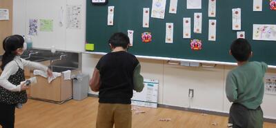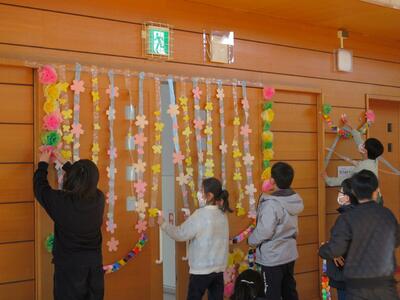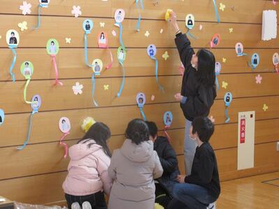 6年生への感謝の思いが伝わる会になるように、5年生が体育館の飾りつけをしました。
