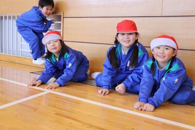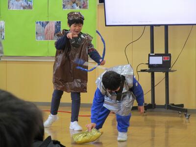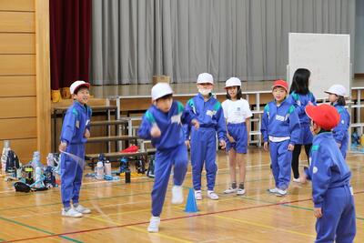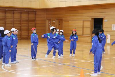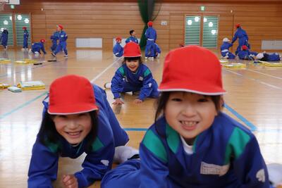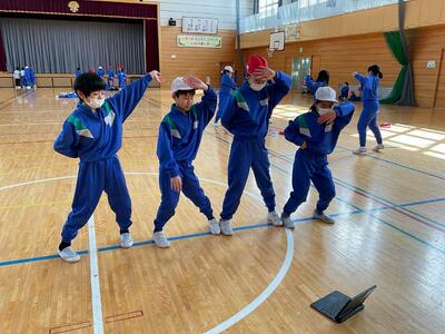 体育の学習では、1~3組合同の班を作り、班ごとにテーマを決めて表現遊びに挑戦しています。