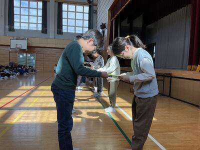 来年度の児童会活動へ向けて、現委員長から新委員長への引継ぎ式を行いました。