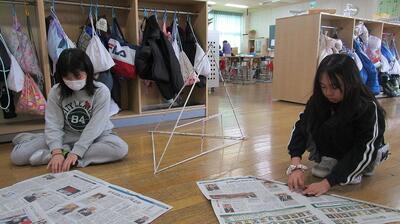 図画工作の時間に、新聞紙を細長く棒にしてつなげる学習を行いました。グループの友達と協力しながら棒を作ったり、くずれないように高くつなげたりすることができました。