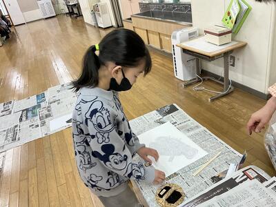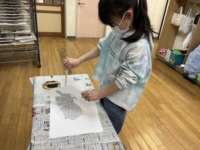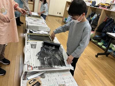 2年生の図工では、今、紙版画にチャレンジしています。生き物をテーマに、「こんな生きものがいたらいいな」を一人一人考えました。そして画用紙を切ったり、貼り合わせたりして紙版を作り、インクをつけて刷っていきました。初めての挑戦に少し緊張しながらも、しっかりとインクを付け、上手に作品を仕上げることができました。乾いた後、できた作品をみんなで紹介し合います。みんなの作品がどんな風に仕上がったのか、楽しみですね。