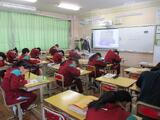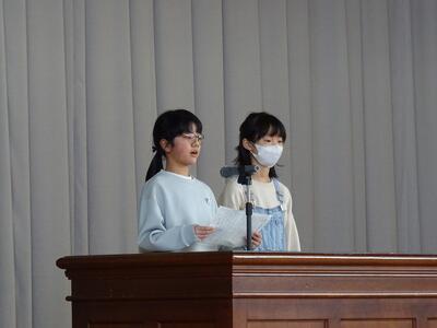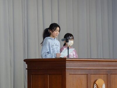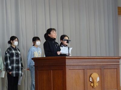 昇降口前の青いラベルに、子供たちが雪を埋め込んで白くしました。