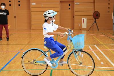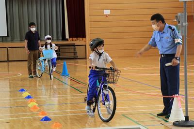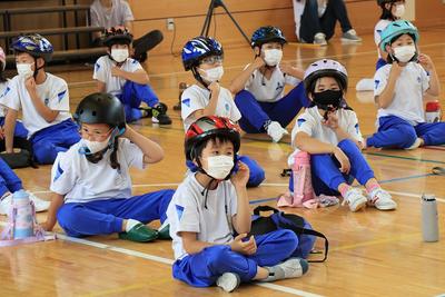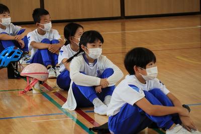 講義のあとは,代表児童が自転車に乗って,PTA評議員のみなさんが準備してくださったコースを乗って,訓練しました。みんなで見学しながら,乗り方を振り返りました。